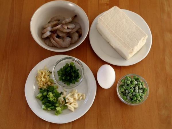 豆腐 1塊、蝦仁 20個、雞蛋 1個、花生油 適量、精鹽 適量、胡椒粉 少許、淀粉 少許、小蔥 1根、姜 2片、蒜 3瓣